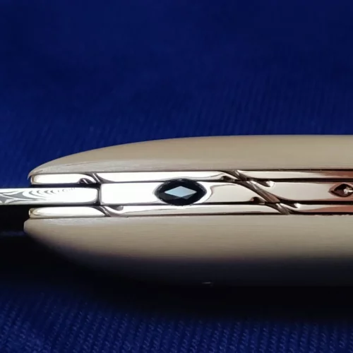 Guilloché sur le dessus et orné de deux diamants et d’un saphir.